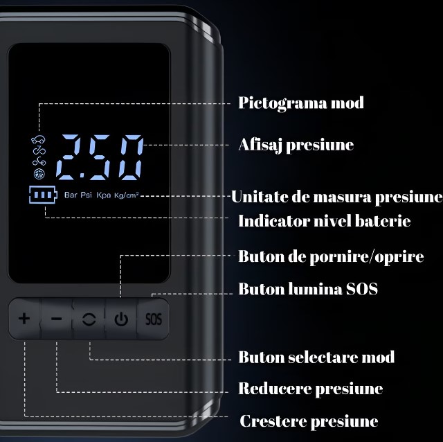 Acest compresor de aer portabil fara fir are si o lanterna LED incorporata si lumina de semnalizare SOS pentru a va ajuta in situatii de urgenta.